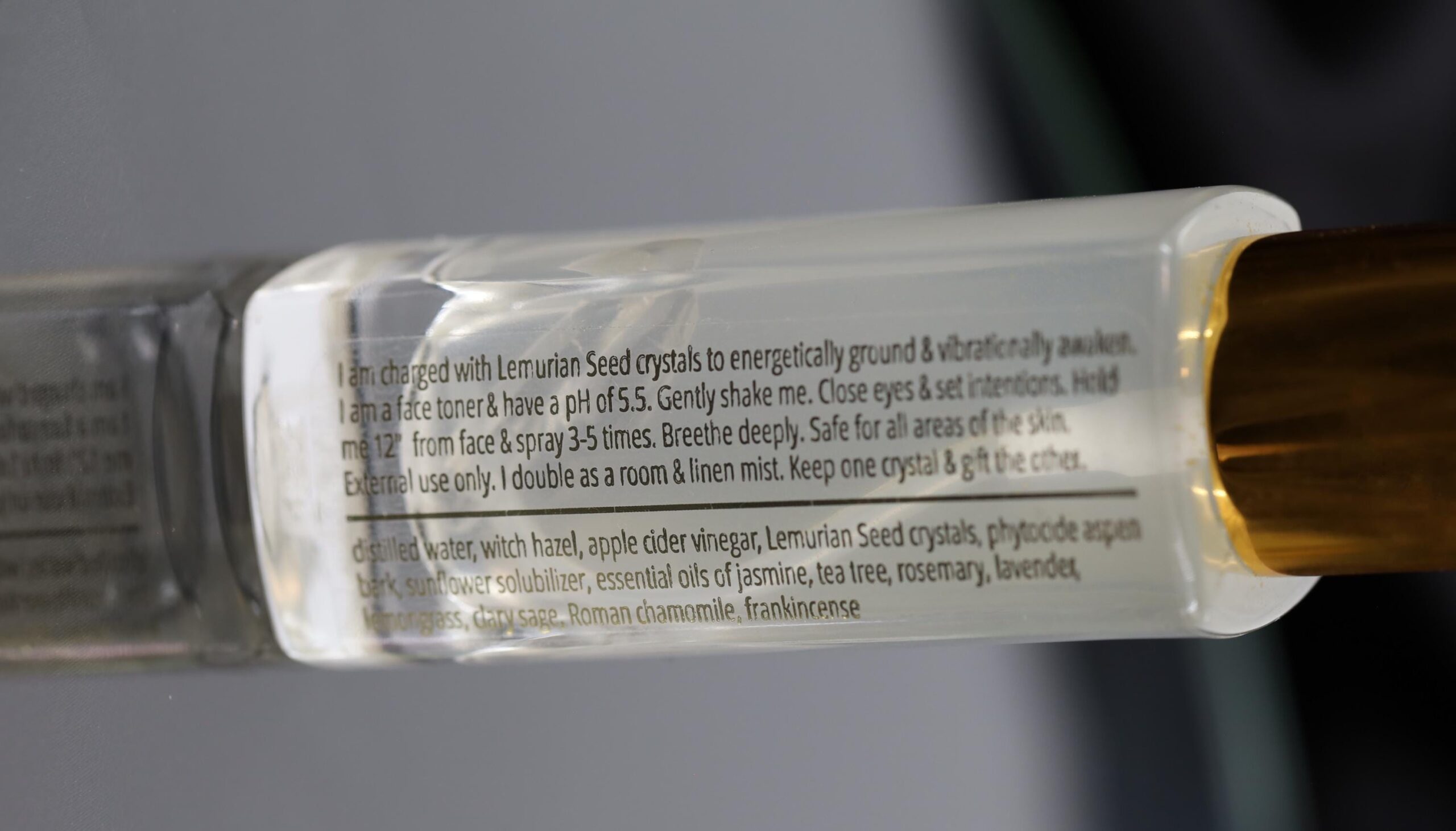 Ingredients: Distilled Water, Witch Hazel, Apple Cider Vinegar, Lemurian Seed Crystals, Phytocide Aspen Bark, Sunflower Solubilizer, Essential Oils of: Jasmine, Tea Tree, Rosemary, Lavender, Lemongrass, Clary Sage, Roman Chamomile, Frankincense